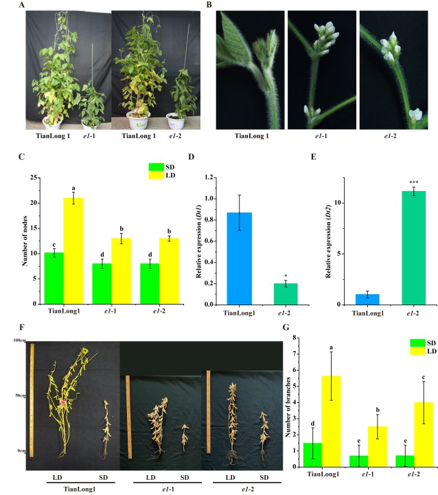 近日,中國科學院東北地理與農(nóng)業(yè)生態(tài)研究所大豆分子設(shè)計育種學科組在Frontiers in Plant Science在線發(fā)表了題為CRISPR/Cas9-mediated targeted mutation of the E1 decreases photoperiod sensitivity, alters stem growth habits, and decreases branch number in soybean的研究論文。該研究利用基因編輯技術(shù),將國審大豆品種天隆1號中的E1基因進行敲除,獲得了無外源基因插入的e1突變體。e1突變體的光周期敏感性顯著降低,但仍然對光周期敏感,將E1敲除后并沒有完全關(guān)閉大豆的光周期反應(yīng)。進一步研究發(fā)現(xiàn),突變體中E1的同源基因E1-La 與 E1-Lb的表達量顯著上調(diào)表達,這說明E1及其同源基因E1-La 與 E1-Lb間存在遺傳補償效應(yīng)。
