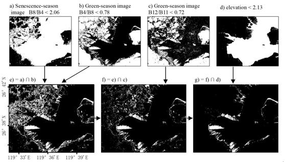 結果顯示,新方法可以高效構建生長季和枯黃季構成的雙時相影像、有效減少誤分類像元、等效逼近已訓練隨機森林模型。此外,本研究提供了一套總體精度92.5%的10米分辨率2020年海岸鹽沼植被分布數據,還構建了針對雙時相影像識別海岸鹽沼植被的潛在機理,即生長季的水信號被植被掩蓋、枯黃季植被枯萎后水信號得到增強。針對雙時相影像識別海岸鹽沼植被分布的潛在機理,進一步解析決策規(guī)則的各組成部分的作用。發(fā)現:枯黃季B8senescence/B4senescence < 2.06 對包含鹽沼植被的高含水率土地覆被響應,生長季B4green/B8green < 0.78 對包含鹽沼植被的低含水率土地覆被響應,二者的交集已有效包含鹽沼植被(圖2)。剩余部分決策規(guī)則分別作用于去除不透水面和水體。可以推測,雙時相影像下鹽沼植被冠層導致的水信號變化或是其遙感識別的潛在機理。