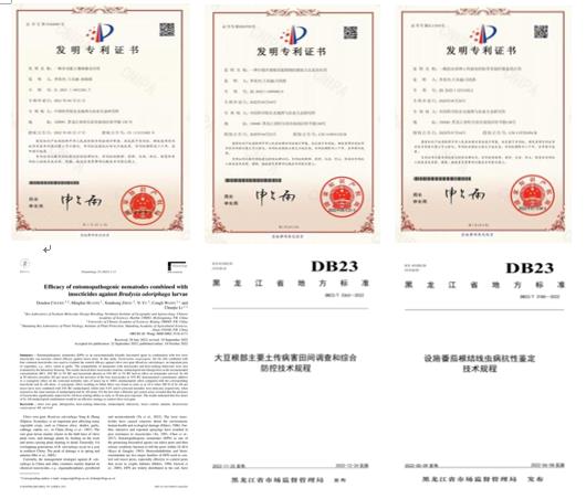 第三,科研骨干從寒區(qū)黑土農(nóng)田中分離和篩選了兩株有益細菌,具有增加大豆根瘤量、利于固氮的功能,對大豆根腐病防效達57.6%,對大豆胞囊線蟲病防效最高達81.8%;同時具有促進植株生長功能,其對蔬菜根結(jié)線蟲病防效達70%以上。這兩株細菌已經(jīng)獲得國家發(fā)明專利,并制定了黑龍江省地方標準,為規(guī)范大豆根部病害的田間調(diào)查方法和科學(xué)防控提供了必要的技術(shù)規(guī)程。