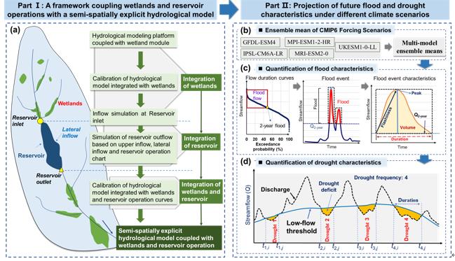 (a)流域濕地-水庫聯合調蓄的分布式耦合框架;(b)基于CMIP6的多情景數據的集合平均;(c)基于閾值法洪水事件的確定和特征的提取;(d)基于游程理論的干旱事件的確定及特征的提取。