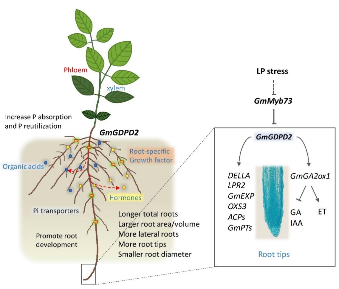 該研究針對大豆需磷量高和土壤有效磷含量低的矛盾,從改良大豆自身遺傳潛力、突破土壤缺磷及磷利用率低的瓶頸限制、進而提高磷利用效率的科學問題出發,通過整合GWAS和連鎖分析,獲得了一個耐低磷主效QTL基因 GmGDPD2。過表達該基因最優單倍型能顯著促進根系生長發育和有機酸分泌,提高大豆對磷的吸收及大豆產量。而敲除該基因則抑制大豆根系生長并降低磷利用效率,且根系發育受阻可通過外源噴施GA合成抑制劑得到恢復。過表達和敲除其互作基因GmGA2ox1也表現出相似表型,且雙突株系表型表現出疊加效應,表明兩基因在應對低磷脅迫中具有協同作用。進一步研究發現上游轉錄因子GmMyb73可以通過結合GmGDPD2啟動子抑制其表達,進而負調控大豆對低磷脅迫的耐受性。這些結果表明GmGDPD2可能通過感知上游信號進而調節根系激素水平影響根系細胞分裂來調節大豆對低磷脅迫的耐受性(圖1)。
