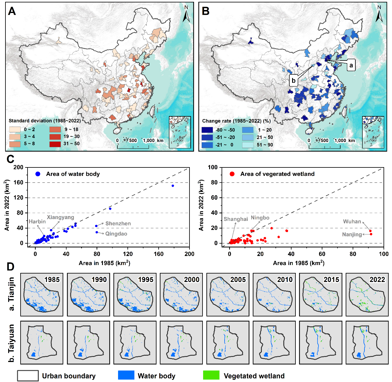 1985-2022年間,中國71個主要城市中有52個城市的城市濕地面積呈現出持續減少的趨勢,其中天津的減少幅度最大,減少了原有面積的 79.40%,其次是烏魯木齊(74.86%)和貴陽(67.55%)。有19個城市的城市濕地面積略有增加,其中呼和浩特的增幅最大(90.63%),其次是北海(89.21%)和西安(71.34%),雖然這些城市的城市濕地增長幅度較大,但由于其原有城市濕地體量較小,因此凈增長面積相對較小(小于3.88 km2)。從地表水體(Surface water)和有植被覆蓋的濕地(Vegetated wetland)兩種城市濕地類型來看,深圳和青島的地表水體在過去近40年損失最大(55.77km2和 33.54km2),南京和武漢的有植被覆蓋濕地損失最大(798.76km2和 75.14km2),哈爾濱和襄陽的地表水體面積、以及寧波和上海的有植被覆蓋濕地的面積均略有增加,但增幅較小。