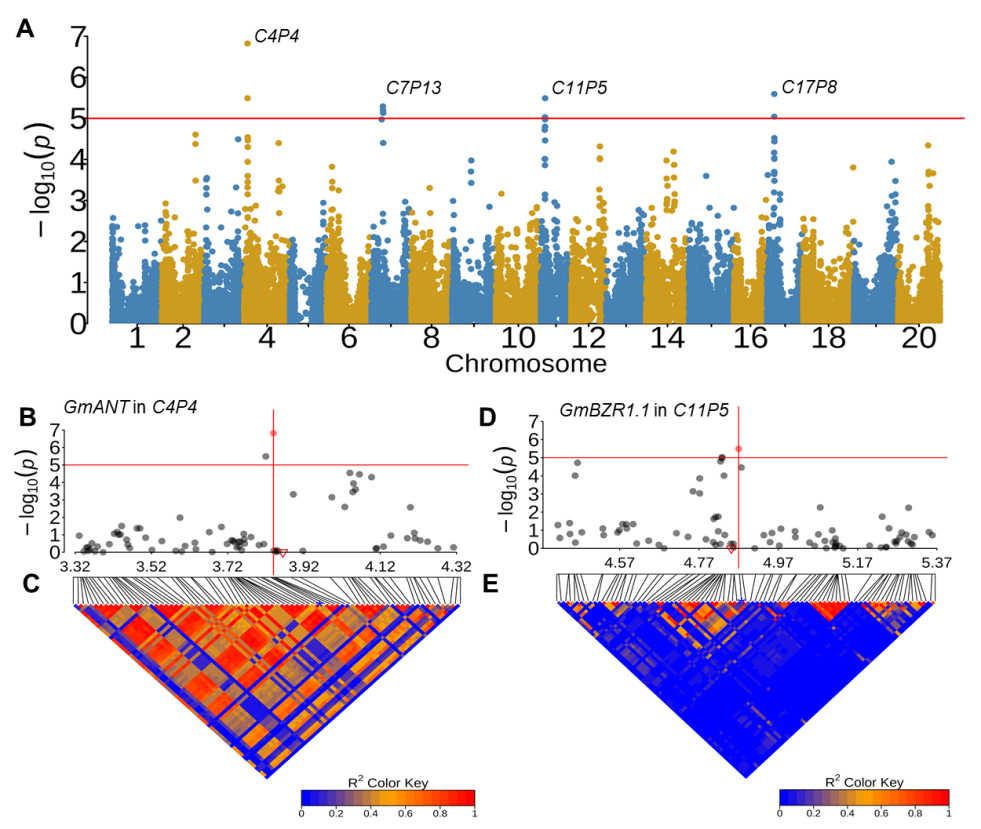 近日,東北地理所大豆遺傳與分子改良學(xué)科組張恒友研究員團隊利用收集的世界大豆全基因組基因分型數(shù)據(jù)和粒重、成熟期數(shù)據(jù),通過對多環(huán)境獲得的表型數(shù)據(jù)的全基因組關(guān)聯(lián)分析研究,鑒定了一批參與大豆粒重和生育期的數(shù)量性狀位點(QTL);同時,利用大豆與擬南芥部分生長發(fā)育的分子機制相對保守的特性,結(jié)合擬南芥已報道粒重和成熟期相關(guān)基因,鑒定了一批大豆粒重和成熟期長短控制相關(guān)候選基因,為這兩個性狀的分子生物學(xué)研究和大豆生物育種提供了重要基因資源(圖1)。團隊正在通過建立的大豆高效遺傳轉(zhuǎn)化平臺研究這些基因在調(diào)控大豆粒重、蛋白質(zhì)和油脂以及成熟期方面的分子機制;同時評價它們在生物育種方面的應(yīng)用潛力。
