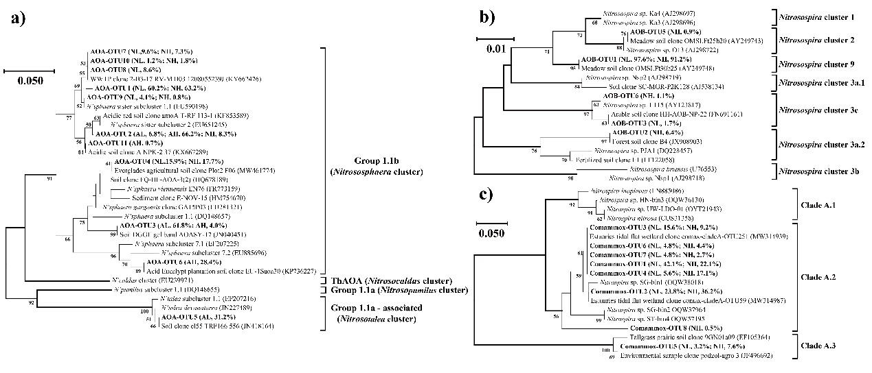 圖2 基于amoA基因13C標(biāo)記的重層DNA中AOA(a)、AOB(b)和comammox Clade A(c)的氨基酸序列構(gòu)建的系統(tǒng)發(fā)育樹