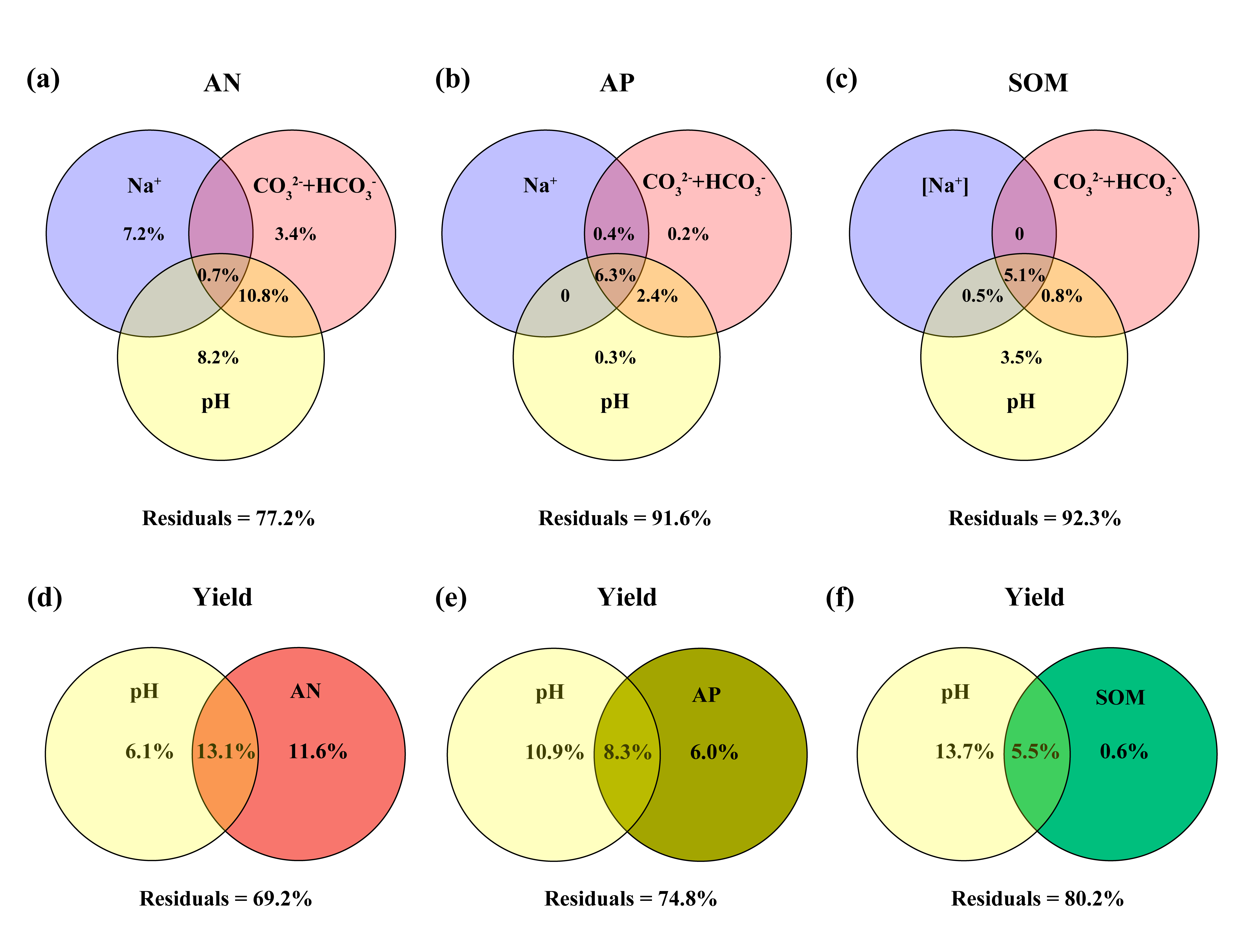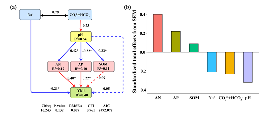 近期,東北地理所科研人員利用吉林大安農(nóng)田生態(tài)系統(tǒng)國家野外科學(xué)觀測研究站內(nèi)隨機(jī)采集的不同鹽堿程度稻田水稻植株和土壤樣品,進(jìn)行科學(xué)分析檢測,通過層次分割和結(jié)構(gòu)方程模型定量評估了土壤不同化學(xué)指標(biāo)對水稻產(chǎn)量的獨(dú)立和綜合影響。結(jié)果表明,土壤pH、[CO32?+HCO3?]和堿解氮(AN)是限制蘇打鹽堿地水稻產(chǎn)量最重要的土壤鹽堿參數(shù)、鹽分離子和養(yǎng)分指標(biāo)。在這些因子中,高濃度的CO32?和HCO3?導(dǎo)致了土壤高pH,土壤高pH是限制蘇打鹽堿地水稻產(chǎn)量的關(guān)鍵,而提高土壤AN含量具有抑制pH和碳酸鹽毒害,提升水稻產(chǎn)量的重要作用。尤其在重度鹽堿土(9 ≤ pH < 10)上,提升土壤AN含量,水稻會表現(xiàn)出更高的增產(chǎn)潛力。因此,降低土壤[CO32?+HCO3?]導(dǎo)致的高pH環(huán)境的同時(shí),提升土壤氮水平是提高鹽堿地水稻產(chǎn)量的關(guān)鍵。