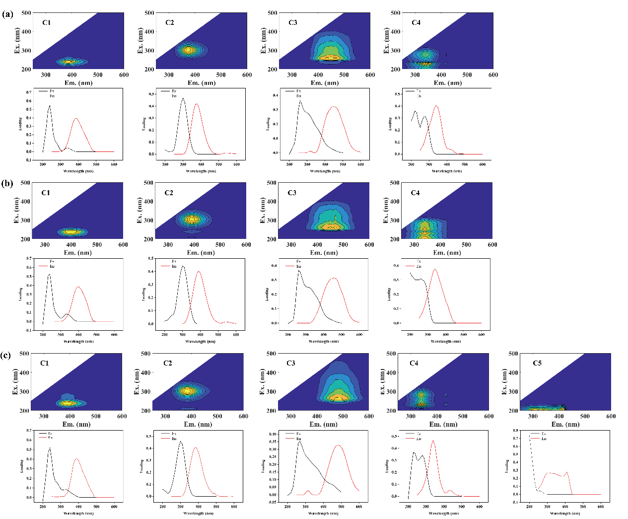 圖1. 通過平行因子分析法(PARAFAC)確定的水溶性有機質(a),富里酸(b)和胡敏酸(c)的熒光組分