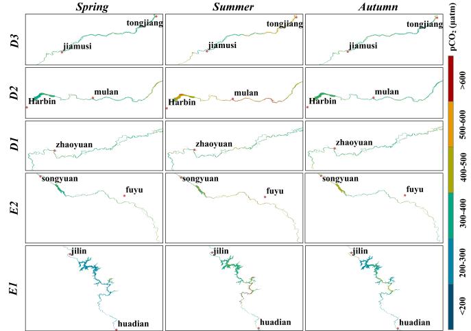 中國科學院東北地理與農業生態研究所水環境遙感學科組科研人員以松花江為研究對象,率先建立了河流表層水體CO2分壓(pCO2)遙感反演算法,利用哨兵二號時間序列衛星影像實現了松花江表層水體pCO2 10m分辨率的逐年高精度制圖,并估算了松花江水-氣界面CO2排放通量。研究結果表明2016-2022年松花江表層水體pCO2年際變化較小,多年均值為395 μatm;通過分析2022年pCO2的逐月反演結果,發現在時間尺度上松花江表層水體pCO2有顯著的季節變化特征:夏季(445±125μatm)>秋季(373±58μatm)>春季(351±57μatm)(圖1);2016-2022年間松花江水-氣界面年均CO2最低排放速率為-4.43±5.76 mmol/m2/d,最高可達8.26±26.92 mmol/m2/d,除2017年松花江為大氣碳源外,其余年份皆為大氣的弱碳匯。本研究為應對氣候變化和評價水體在大氣溫室氣體源匯格局中的作用提供了重要的科學依據。