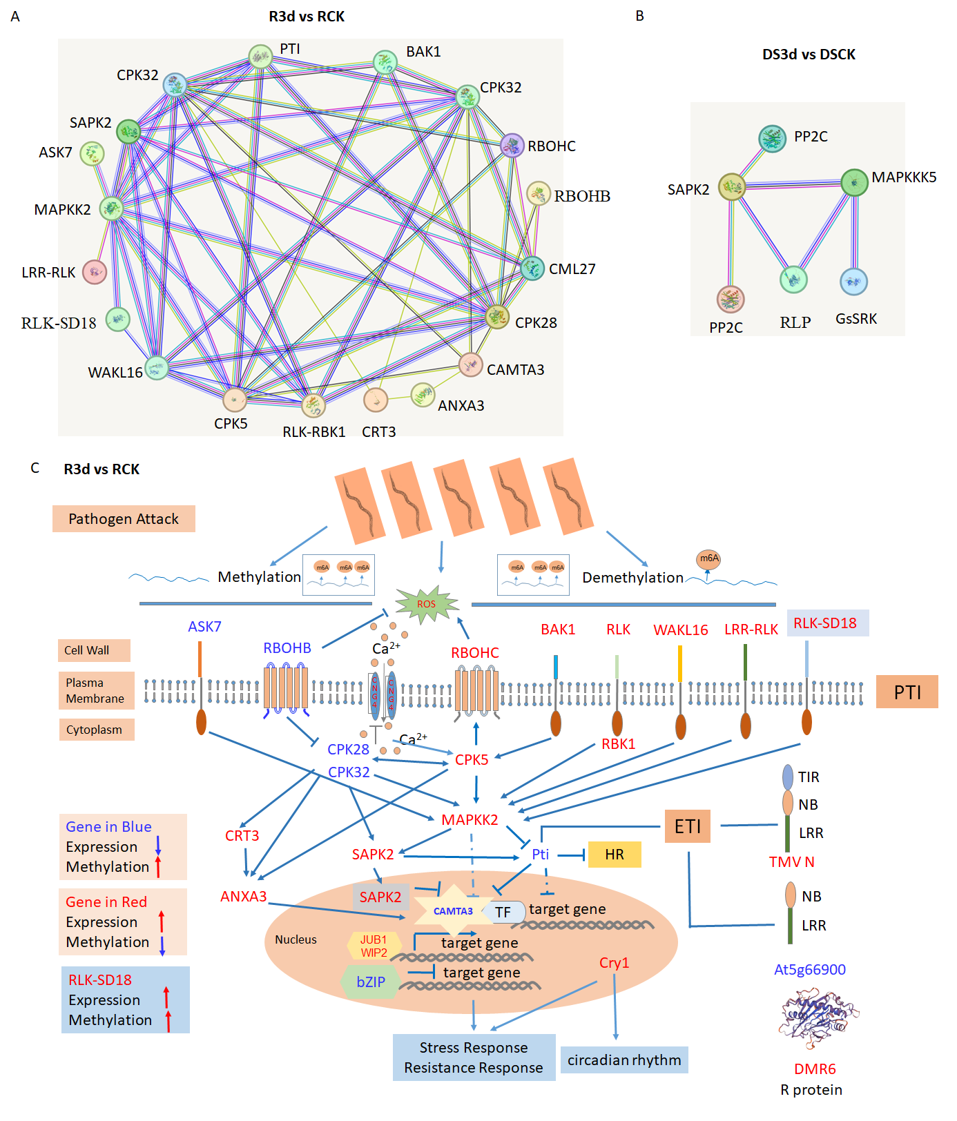 近日,東北地理所農(nóng)田有害生物學科組李春杰研究團隊采用先進的m6A測序和RNA測序技術,探討了m6A修飾對基因表達和植物防御反應的影響。通過對大豆高抗品種和高感品種的對比研究,明確了m6A甲基化在大豆孢囊線蟲病抗感基因型中的分布及動態(tài)變化。結(jié)果表明,大豆孢囊線蟲侵染高抗品種后,上調(diào)和下調(diào)差異m6A峰(DMPs)的比例是1:22(205:4495);而在感病品種中,其比例接近1:1(1662:1774)(圖1)。該結(jié)果說明SCN的4號生理小種侵染抗病種質(zhì)后能夠抑制大豆m6A甲基化修飾。結(jié)合轉(zhuǎn)錄組分析差異表達基因(DEGs)發(fā)現(xiàn),關鍵的抗性和防御相關基因顯示出上調(diào)表達和甲基化被抑制,包括抗性R基因、受體激酶和轉(zhuǎn)錄因子等重要調(diào)控元件。相反,在高感品種中,與感病性相關基因的表達增加且甲基化減少,包括霉菌位點O樣蛋白(MLO)和影響防御機制的調(diào)控元件。通過對重疊的DMPs/DEGs基因的GO/KEGG富集分析,結(jié)合蛋白質(zhì)-蛋白質(zhì)相互作用,構(gòu)建了抗病反應中的關鍵調(diào)控網(wǎng)絡模型(圖2)。在抗病品種中,有19個DMPs/DEGs互作,而感病品種中只有6個DMPs/DEGs互作。在抗病反應中,SCN侵染抑制了甲基化反應,卻促進了與細胞受體激酶相關基因和抗性基因的表達。該調(diào)控網(wǎng)絡模型(圖2)揭示了SCN侵染能夠抑制大豆m6A甲基化修飾,從而提高SCN防御相關膜受體和抗性基因的表達。甲基化模式與基因表達之間的動態(tài)相關性進一步解釋了大豆對SCN的抗感機制。此外,研究還揭示了m6A修飾、可變剪接、microRNA和基因調(diào)控之間的復雜相互作用可能共同調(diào)控大豆的抗感反應。以上研究結(jié)果不僅有助于深入理解植物-線蟲互作機制,還為開發(fā)新的線蟲防控策略提供了重要的理論基礎。