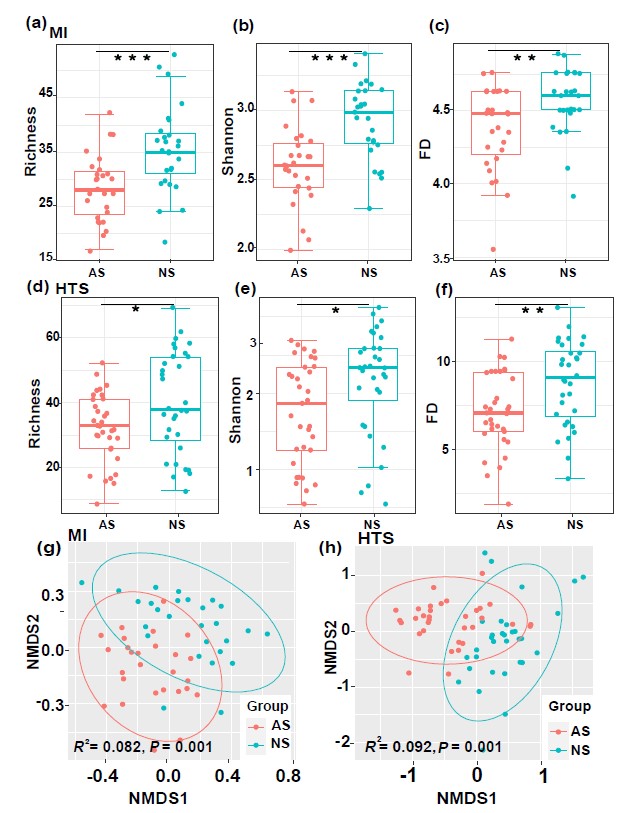 圖1 農(nóng)田(AS)和草地(NS)土壤中線蟲的α多樣性和β多樣性。通過形態(tài)學(xué)鑒定方法(MI)和高通量測序方法(HTS)獲得的物種豐富度(a,d)、香農(nóng)多樣性(b,e)、功能多樣性(c,f)和非度量多維標(biāo)度圖(g,h)。