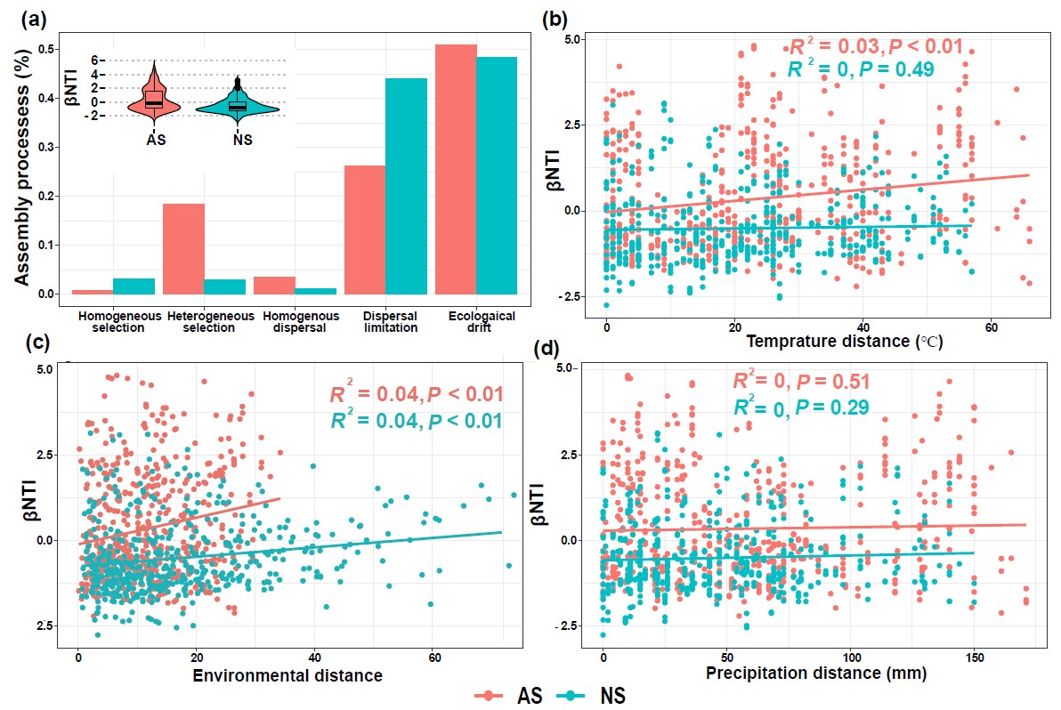 圖2 農(nóng)田土壤(AS)和草地土壤(NS)中線蟲群落組裝過程的影響因子。線蟲群落組裝過程對土地利用轉(zhuǎn)換的響應(yīng)(a)。線蟲βNTI與溫度距離(b)、環(huán)境距離(c)和降水距離(d)之間的關(guān)系。