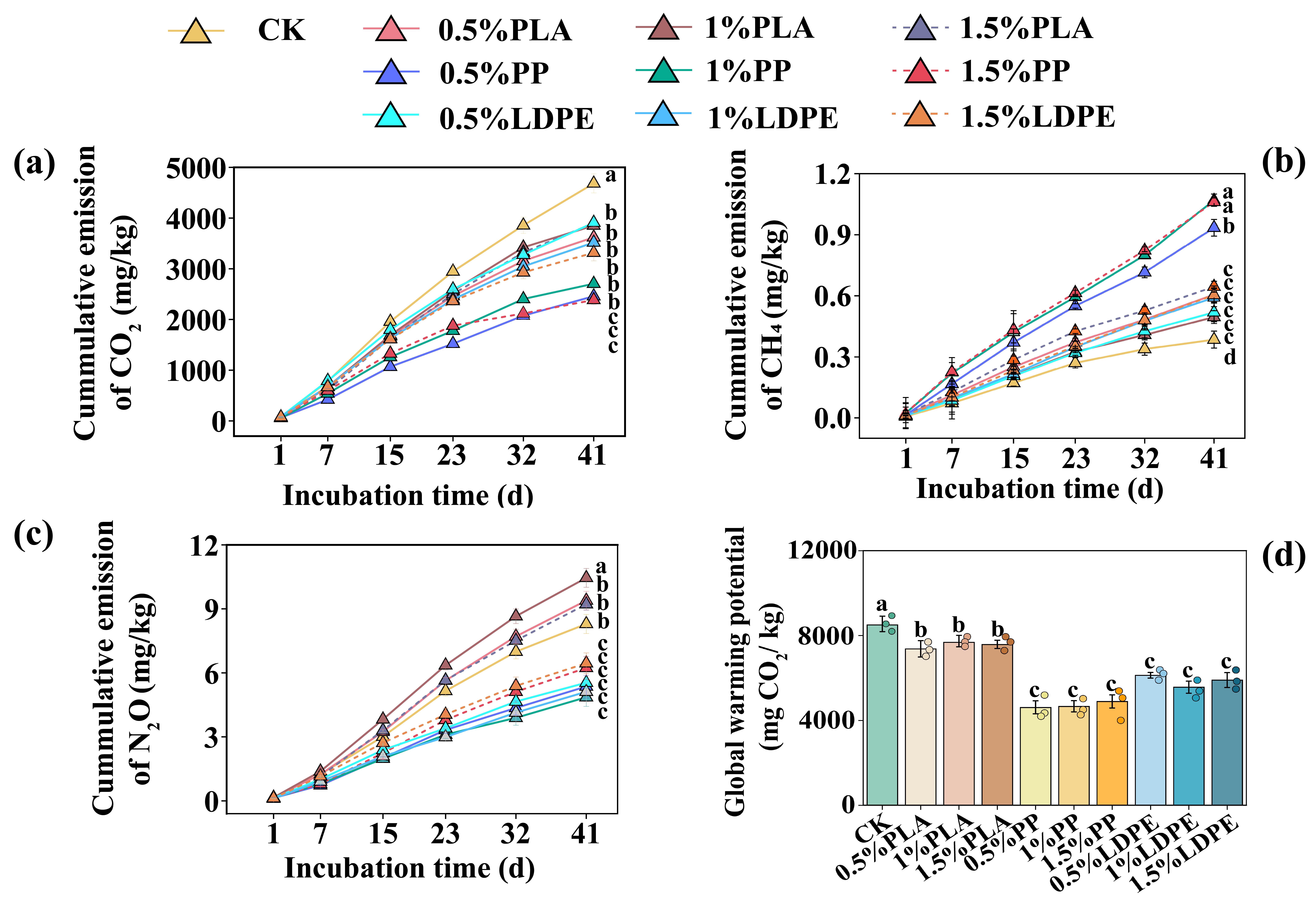 結果表明,不同類型的微塑料添加均顯著提高了土壤的碳養分與pH,但對土壤氮養分與DOM的化學多樣性的影響存在差異。三種微塑料添加均有效抑制了土壤CO2的累計排放量,其中低密度聚乙烯與聚丙烯添加能夠顯著抑制土壤N2O排放,降低全球增溫潛勢。DOM熒光特性、土壤化學性質和微生物多樣性指數是解釋溫室氣體排放的關鍵指標。