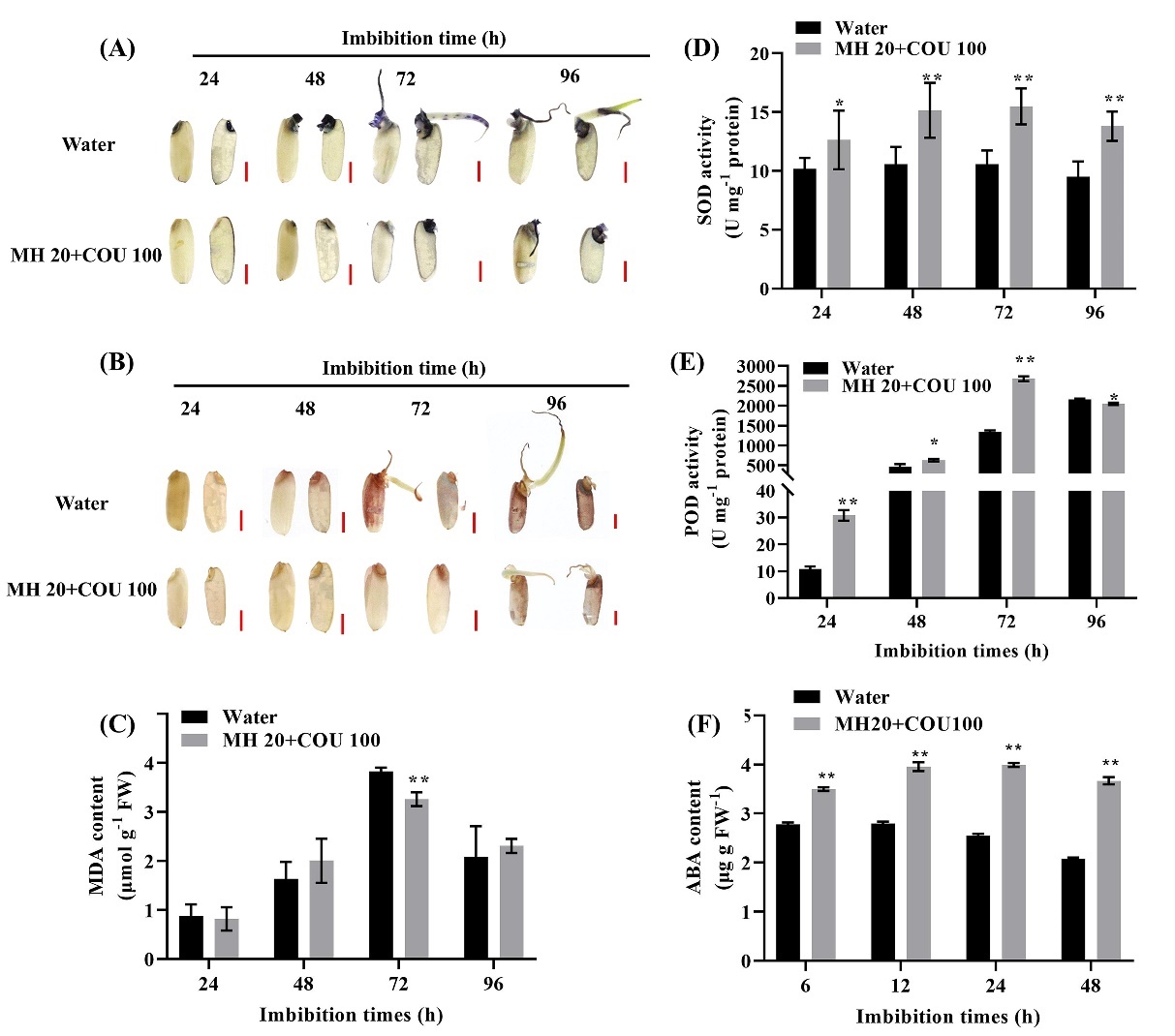 研究團隊通過連續和短期浸種實驗,從馬來酰肼(MH)、香豆素(COU)和丁香酚(EUG)三種穗發芽抑制劑中篩選出穗發芽抑制劑的最佳組合為MH 20 mg L-1 + COU 100 mg L-1,該組合可顯著降低水稻種子發芽率。進一步研究表明,該組合處理顯著降低了種子萌發過程中的α-淀粉酶活性,減少了可溶性糖和可溶性蛋白的含量,從而抑制了種子萌發所需的能量和物質供應。該組合還能調節抗氧化酶活性,抑制活性氧(ROS)的積累,減少MDA的產生;促進種子內ABA含量快速積累(圖1)?;虮磉_分析表明,MH和COU組合通過調節OsNCED1/2/5和OsABA8ox1-3表達,精準調節水稻種子內ABA的含量。在不同萌發階段,該組合對ROS產生基因OsRbohs表達的調節不同,還下調了α-淀粉酶基因(OsAmy1A和OsAmy3D)的表達。體外模擬萌發試驗進一步證實該PHS抑制劑組合能夠有效降低種子萌發(圖2)。