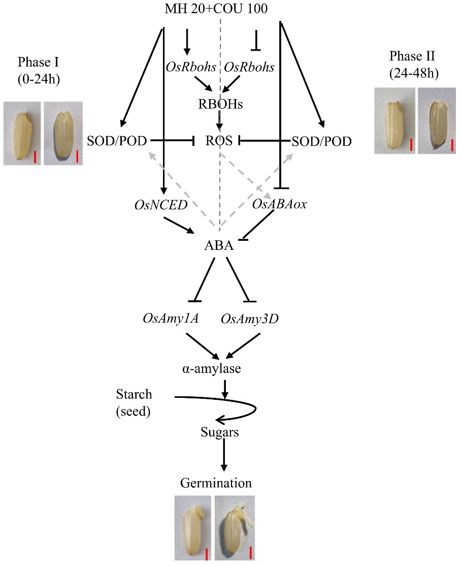 該研究首次報道了MH和COU復配對水稻種子萌發的協同抑制作用,揭示了其抑制水稻種子萌發的機制,涉及ROS積累、ABA代謝和淀粉降解等多個生理過程,并繪制了相應的機制模型(圖3),研究成果不僅加深了對PHS抑制劑調控種子萌發機制的理解,也為MH和COU在防止穗發芽的應用中提供了理論支持,有望在農業生產中得到廣泛應用。