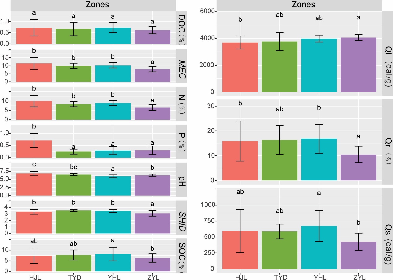 Fig.1 ANOVA analysis of soil properties,Qs,Ql and QR. Different letters meant differences at a significant level.