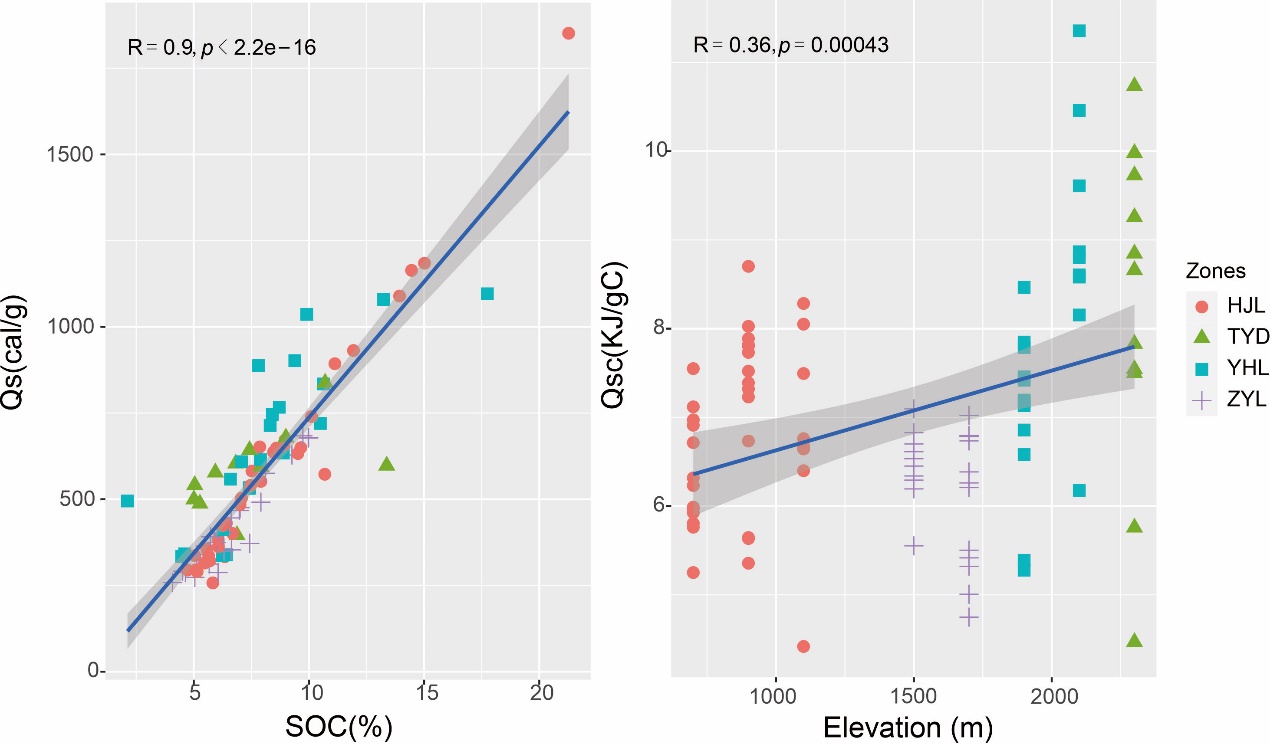 Fig.2 Linear regression between SOC and Qs, between Qsc and elevation. Different shapes and colors represented samples from different zones.