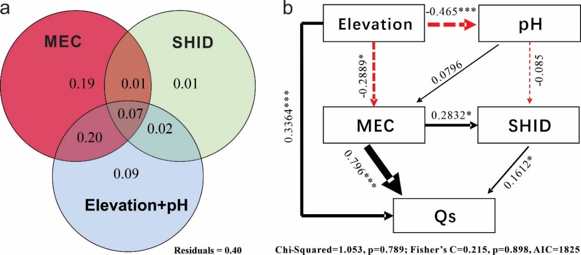 VPA分析證實MEC對Qs的影響最大,MEC可單獨解釋Qs變化的19%, MEC與環(huán)境因素(海拔和pH)結(jié)合可以共同解釋20%的Qs變異性(圖3a)。環(huán)境因素或SHID單獨對Qs變異的解釋能力相對較低,分別為9%和1%,而MEC、SHID和環(huán)境因素聯(lián)合可解釋60%的Qs變異性。SEM模型顯示海拔、MEC和SHID均對Qs具有正效應(yīng),其大小順序為MEC>海拔>SHID(圖3b)。
