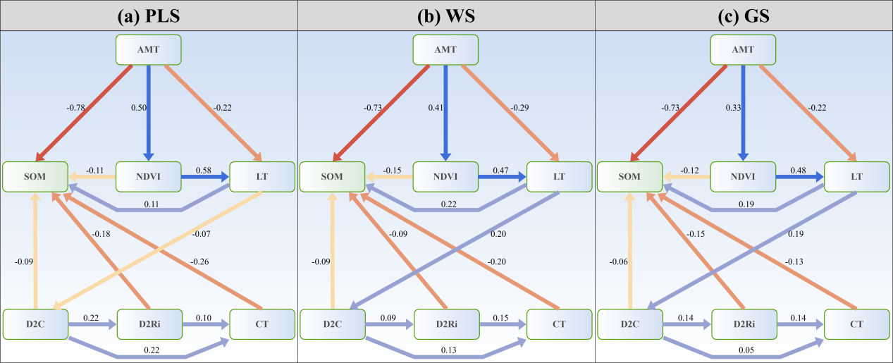 圖2. 結(jié)構(gòu)方程模型展示了不同尺度下各驅(qū)動因素對SOM的直接影響和間接影響