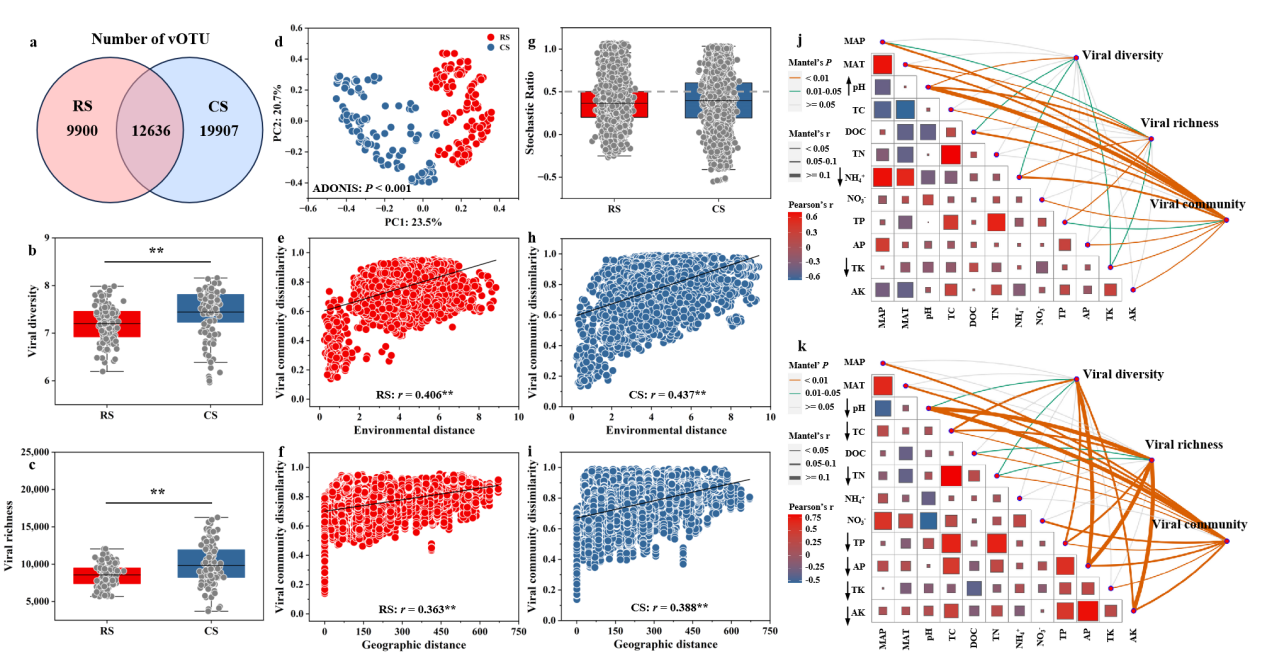 為此,東北地理所農田分子生態學科組研究人員大范圍采集了典型黑土帶的水稻土和毗鄰的玉米地土壤,利用宏基因組測序技術,解析了水田(RS)和旱作土壤(CS)病毒群落地理分布格局及病毒攜帶ARGs的傳播機制和生態策略。