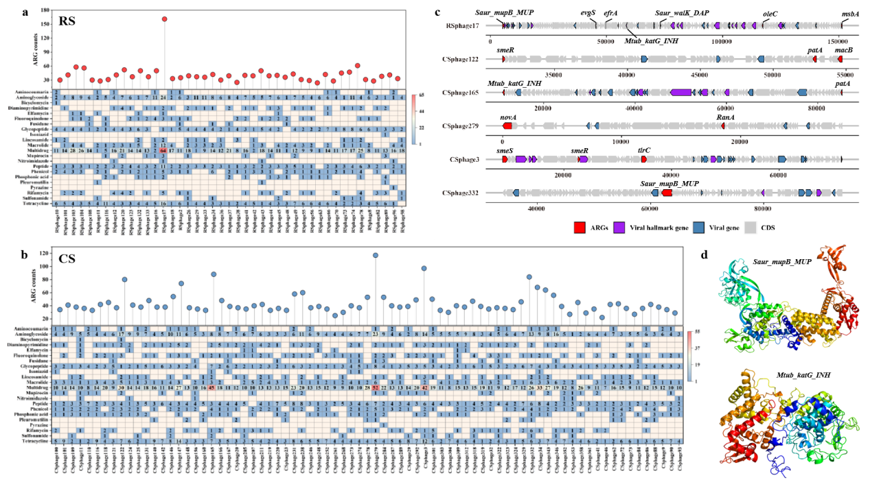 研究表明,東北黑土帶土壤病毒群落存在顯著距離衰減模式。與RS相比,CS中的病毒群落具有更高的群落多樣性和差異顯著的群落結構,但RS和CS中的病毒群落并不具有維度多樣性梯度格局(圖1)。土壤pH是決定病毒群落分布的主要因素,而較高的土壤養分含量顯著降低病毒群落多樣性。Uroviricota、Nucleocytoviricota和Artverviricota是農田土壤中的主要病毒門,同時發現病毒群落的宿主涉及包括放線菌、變形菌等在內的17個原核微生物門。此外,我們在RS和CS中檢測出了27類抗生素抗性類型,其中多重耐藥型在黑土中的占比最高。結合病毒群落數據發現,RS和CS中攜帶ARGs的病毒數分別占總群落的9.61%和11.4%。進一步拼接構建環狀噬菌體基因組發現,RS中的溶原噬菌體攜帶了29.7%的ARGs,明顯高于CS中的12.5%,而CS中攜帶ARGs的病毒主要為烈性噬菌體(圖2)。本研究揭示了黑土帶區域尺度上的兩類農田土壤中病毒和抗生素抗性基因的分布特征及病毒攜帶ARG的裂解溶原策略。