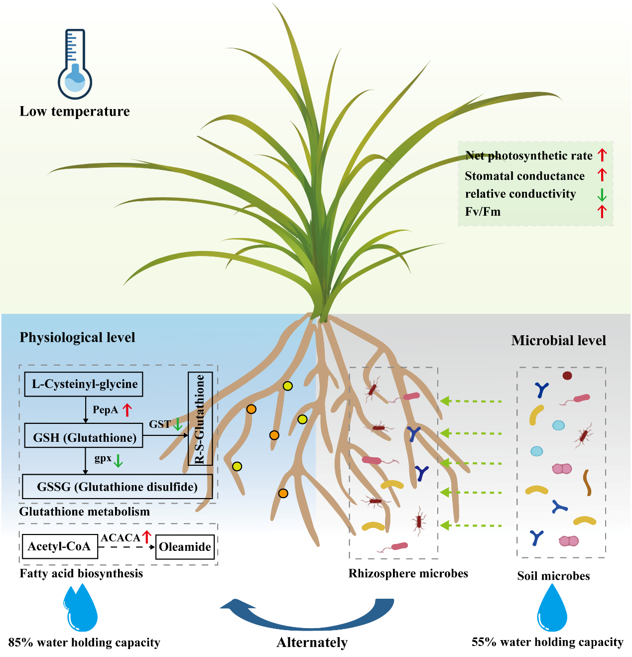 低溫導(dǎo)致作物植株細(xì)胞膜通透性改變、限制光合碳同化能力,對作物生產(chǎn)造成極大影響。根際微生物通過代謝調(diào)節(jié)、細(xì)菌細(xì)胞外多糖產(chǎn)生、抗氧化防御和促進(jìn)根系生長等方式幫助作物應(yīng)對環(huán)境脅迫。分根區(qū)干旱灌溉已被廣泛用于調(diào)節(jié)作物根系發(fā)育和緩解環(huán)境脅迫,但現(xiàn)有的研究主要關(guān)注干旱和鹽脅迫下作物的生理機(jī)制,對灌溉誘導(dǎo)的根系代謝和根際微生物組的改變?nèi)绾未龠M(jìn)低溫抗性的見解有限。