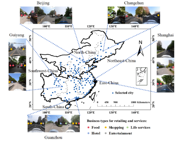圖2 項目研究城市的選取及典型商業(yè)街區(qū)調(diào)查點(diǎn)位布局示意圖