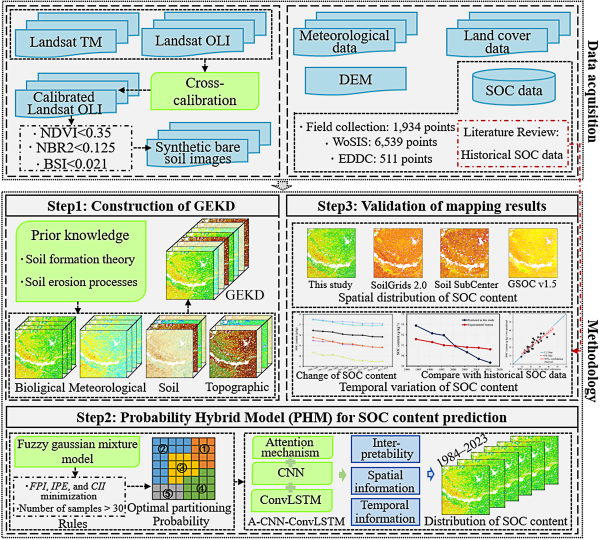 為了應(yīng)對這些挑戰(zhàn),中國科學(xué)院東北地理與農(nóng)業(yè)生態(tài)研究所農(nóng)業(yè)遙感學(xué)科組研究人員收集了8984個土壤樣本、956423張Landsat TM/OLI遙感影像、數(shù)字高程模型和氣象數(shù)據(jù),開發(fā)了一個考慮土壤形成與侵蝕過程的地理知識數(shù)據(jù)集(GEKD)。該數(shù)據(jù)集被輸入概率混合模型(PHM)進(jìn)行區(qū)域劃分,并進(jìn)一步結(jié)合注意力機制、卷積神經(jīng)網(wǎng)絡(luò)與長短期記憶網(wǎng)絡(luò)(A-CNN-ConvLSTM)構(gòu)建高精度SOC預(yù)測模型。