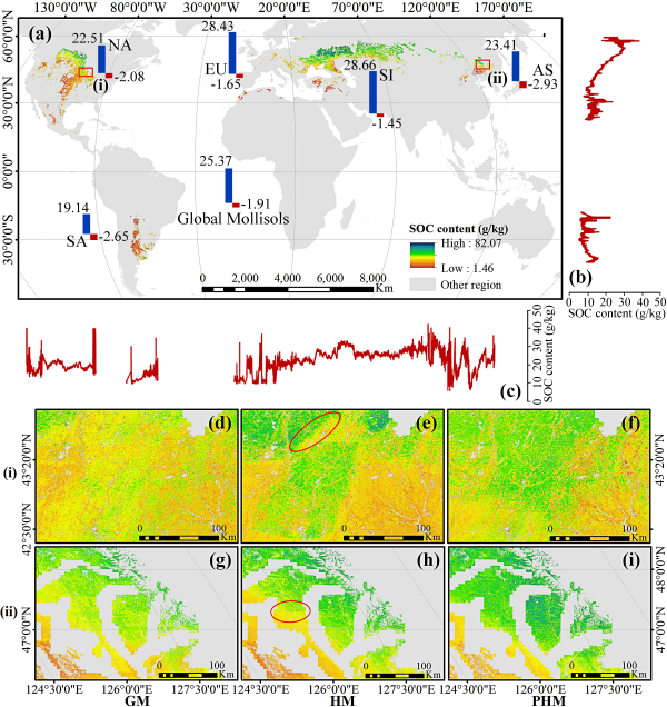 研究結(jié)果顯示,結(jié)合GEKD和A-CNN-ConvLSTM算法,SOC含量預(yù)測精度達(dá)到RMSE = 7.17 g/kg、R2 = 0.72、RPIQ = 1.92,優(yōu)于傳統(tǒng)模型。此外,PHM模型有效降低了SOC空間異質(zhì)性帶來的誤差,使預(yù)測結(jié)果更加平滑、穩(wěn)定。與全球模型相比,PHM將RMSE降低1.66 g/kg,R2和RPIQ分別提高0.06和0.15。研究生成了自1984年以來全球黑土區(qū)30m分辨率的SOC空間圖,并揭示了SOC含量下降的整體趨勢。其中,全球黑土區(qū)SOC平均下降1.91 g/kg,亞洲黑土區(qū)降幅最大(2.93 g/kg),西伯利亞黑土區(qū)降幅最小(1.45 g/kg)。該研究不僅為全球黑土區(qū)SOC動態(tài)監(jiān)測提供了新技術(shù)手段,還為黑土區(qū)碳匯管理和農(nóng)業(yè)可持續(xù)發(fā)展提供了科學(xué)支撐。