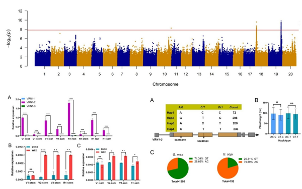 圖1. 大豆株高全基因組關聯分析以及候選基因VRN1-2的表達和單倍型分析