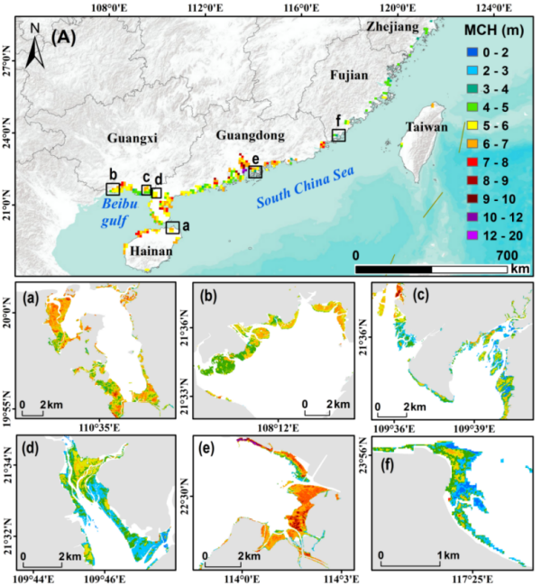 圖1中國紅樹林冠層高度空間分布圖及國家級紅樹林自然保護區內紅樹林冠層高度圖;(a)海南東寨港;(b)廣西北侖河口;(c)廣西山口;(d)廣東高橋;(e)深圳福田和香港米浦;(f)福建漳江口。