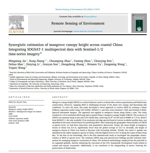 該研究發表在國際頂級期刊《Remote Sensing of Environment》,中國科學院東北地理與農業生態研究所為第一完成單位,賈明明副研究員為第一作者,張蓉特別研究助理為通訊作者。研究獲國家重點研發計劃青年科學家項目(2023YFF1305600)、國家自然科學基金(42076161,42101392)及可持續發展大數據國際研究中心開放研究計劃項目(CBAS2022ORP06)支持。
