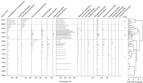 圖1 宏圖(HT)泥炭剖面硅藻化石組合百分比圖