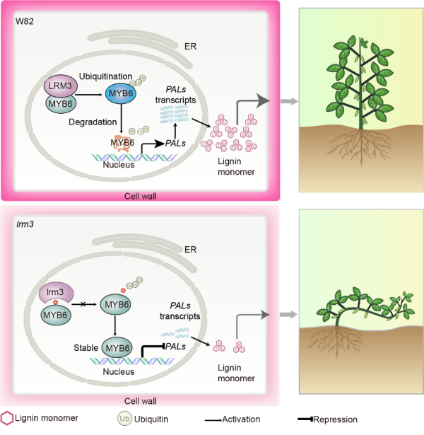 中國科學院東北地理與農業(yè)生態(tài)研究所馮獻忠研究團隊通過大規(guī)模篩選大豆突變體庫,分離到倒伏突變體lodging-related mutant 3(lrm3),與野生型相比,lrm3突變體的莖稈中木質素含量下降80%,莖稈強度下降60%。通過圖位克隆技術,克隆了控制倒伏表型的目的基因LRM3,該基因編碼一個U-box型E3泛素連接酶。進一步實驗證明,LRM3可以通過26S蛋白酶體途徑促進MYB6蛋白的降解來提高大豆的抗倒伏性;MYB6蛋白直接結合在木質素合成限速酶—苯丙氨酸解氨酶PAL1/2的啟動子上抑制其表達,從而降低木質素的合成,降低大豆抗倒伏性。這項研究發(fā)現了調控大豆莖稈強度的LRM3-MYB6-PALs的分子模塊,為大豆抗倒伏性狀的分子育種提供了重要的分子靶標。