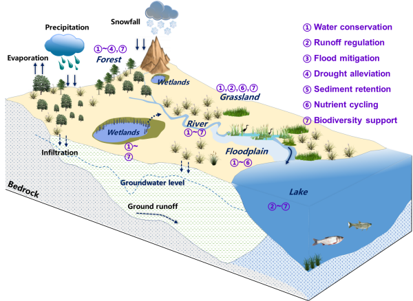 在全球氣候變化與人類活動的影響下,濕地作為地球生態系統的關鍵節點,其水文多功能性在全球生態與水資源管理領域備受矚目(圖1)。濕地不僅是生物多樣性的庇護所,更是水循環的重要調節器,具備調節徑流、緩解洪水、維持低流量、促進地下水補給以及支持生物多樣性等多種水文功能。然而,當前研究多聚焦于濕地的單一水文功能,對于濕地綜合水文功能的協同作用與整體貢獻尚缺乏系統性認識,這限制了濕地在流域水資源管理與生態保護中潛力的充分挖掘。如何從流域尺度量化濕地的水文多功能性,成為國際生態水文學領域的前沿科學問題