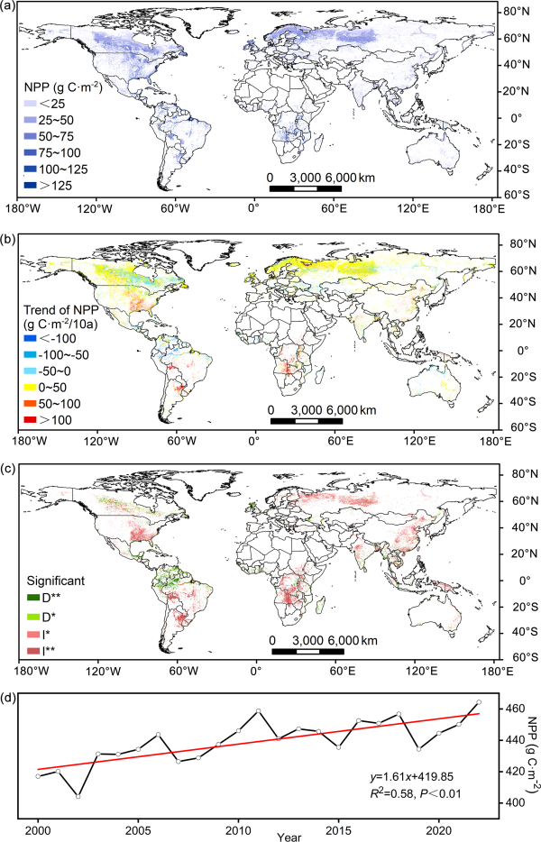 圖1 全球沼澤濕地植被凈初級生產(chǎn)力格局及時空變化