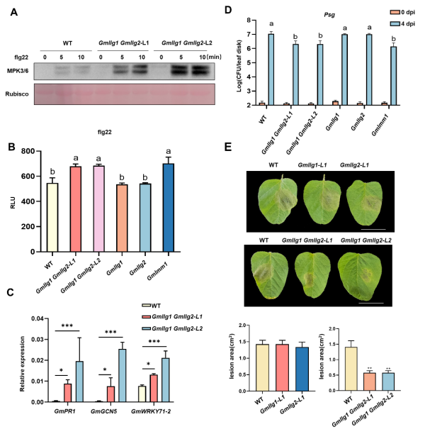 實驗室前期研究篩選到免疫自激活突變體Gmlmm1(lesion mimic mutant),它編碼一個CrRLK1L蛋白,調控免疫受體GmFLS2與GmBAK1結合,抑制免疫過度激活。本研究發現大豆GmLLG1/2與GmLMM1協同調控大豆免疫和抗病性,Gmllg1 Gmllg2突變體免疫和抗病性增強,GmLLG1/2調控GmLMM1的細胞膜定位,進一步研究發現小肽GmRALF1和GmRALF18可以負調控免疫,并可以與GmLLG1/2互作。Gmllg1 Gmllg2抗性增強的同時產量相關農藝性狀不受影響。本研究不僅深化了對大豆免疫機制的理解,也為培育抗病高產大豆新品種提供了新的基因資源。