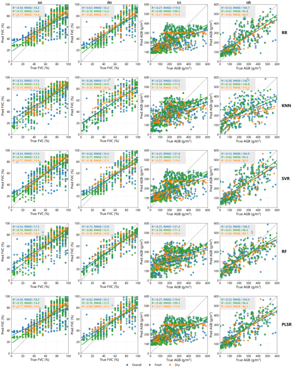 建模過程中,研究采用了五種主流回歸算法(嶺回歸、k近鄰、支持向量回歸、隨機(jī)森林和偏最小二乘回歸),并分別在兩組輸入變量上開展訓(xùn)練。結(jié)果表明,對(duì)鮮草和干草分別建模,平均可提升模型決定系數(shù)(R2)0.23,最大降低均方根誤差(RMSE)達(dá)41%。其中,融入植被高度信息對(duì)提升AGB估算精度尤為關(guān)鍵,最優(yōu)模型R2可達(dá)0.62(圖3)。該研究所提出的技術(shù)框架僅依賴輕量化RGB影像和低成本計(jì)算資源,具備實(shí)地實(shí)時(shí)應(yīng)用的巨大潛力,為多尺度草地遙感監(jiān)測(cè)與生態(tài)評(píng)估提供了新的可靠工具。