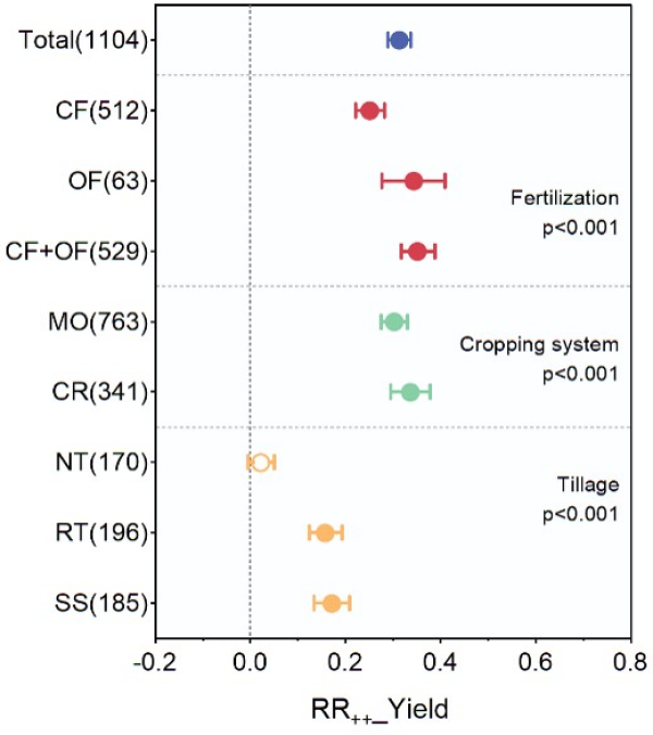 圖2 作物產(chǎn)量響應(yīng)土壤管理類型的平均效應(yīng)大小
