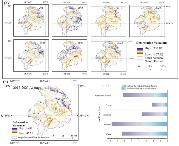 青藏高原若爾蓋泥炭地是世界上海拔最高、面積最大的高寒泥炭地系統(tǒng),被譽為“高原之腎”,對維系青藏高原水源涵養(yǎng)與區(qū)域碳平衡具有關(guān)鍵作用。然而,自20世紀60年代以來,持續(xù)排水、過度放牧與氣候變暖導致泥炭層水位下降、植被退化和碳儲量削弱,生態(tài)退化問題日益突出。由于高原地區(qū)地處偏遠、相干性低,以往缺乏對泥炭地表層形變的連續(xù)監(jiān)測。針對這一科學問題,研究團隊利用歐洲航天局Sentinel-1衛(wèi)星C波段雷達影像,結(jié)合小基線集(SBAS)InSAR時序干涉技術(shù),實現(xiàn)了2017—2023年若爾蓋地區(qū)的高精度地表形變反演與動態(tài)評估。