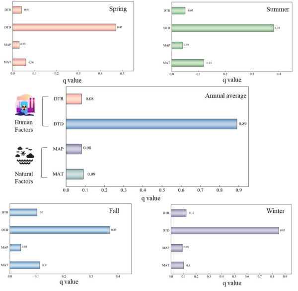 通過GeoDetector空間探測模型分析,研究發(fā)現(xiàn)排水溝密度和距離是泥炭地沉降的最強驅(qū)動因素(q = 0.89),表明人為水文改造直接導致了地表下陷和泥炭壓實。道路建設(shè)及放牧活動在局部區(qū)域亦加劇了沉降過程。氣候因子方面,降水減少和氣溫升高在干旱年份強化了季節(jié)性下沉,但其空間解釋力較弱,主要表現(xiàn)為冬季凍融過程對地表穩(wěn)定性的調(diào)制作用。研究指出,泥炭地的沉降是長期水文擾動和季節(jié)性氣候反饋共同作用的結(jié)果。