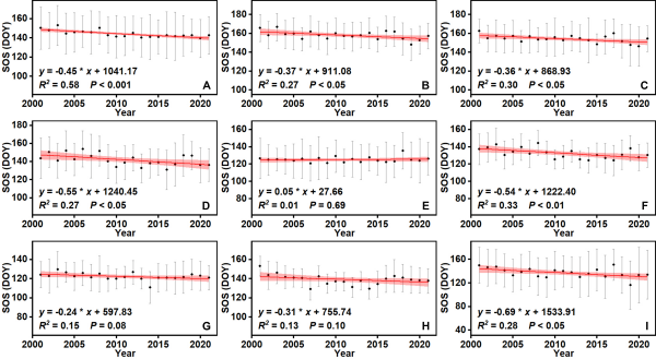 圖1中國濕地春季物候變化的時間趨勢