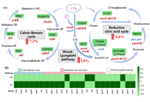 圖 1?耐鹽堿固碳菌DA1多通路固碳的機(jī)制框架