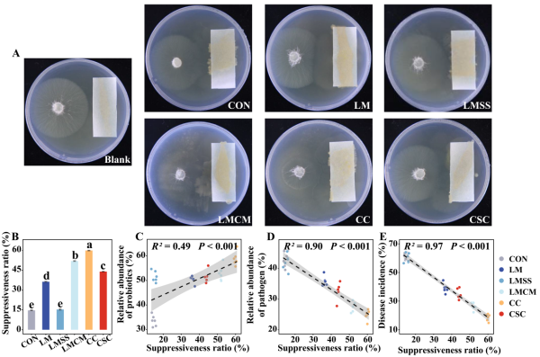 基于海倫水土保持監(jiān)測(cè)研究站的田間定位試驗(yàn)平臺(tái),設(shè)置了對(duì)照(CON)、石灰(LM)、石灰秸稈配施(LMSS)、石灰牛糞配施(LMCM)、2%粗甲殼素(CC)及硅鈣鉀鎂肥(CSC)6種改良處理,系統(tǒng)評(píng)估了其對(duì)土壤性質(zhì)、微生物群落、大豆根腐病發(fā)病率及產(chǎn)量的影響。結(jié)果顯示,改良劑能有效降低大豆根腐病發(fā)病率和提高大豆產(chǎn)量,其中CC抑病和增產(chǎn)效果最大,根腐病發(fā)病率降低70%,產(chǎn)量提高30%以上。土壤改良劑顯著富集了具有抑病和促生功能的潛在有益物種,如Pantoea、Bacillus、Humicola、 Tausonia和Mortierella,同時(shí)減少了潛在病原菌(圖1)。體外共培養(yǎng)實(shí)驗(yàn)進(jìn)一步驗(yàn)證,改良土壤的根際細(xì)菌懸液明顯抑制了病原菌菌絲的生長(zhǎng),且該抑病能力與富集的有益菌豐度呈顯著正相關(guān)(圖2)。土壤改良劑,特別是CC處理誘導(dǎo)了最高的微生物抗性,證實(shí)改良劑能夠通過(guò)誘導(dǎo)健康的微生物區(qū)系來(lái)緩解連作障礙(圖3)。本研究明確了“改良劑-微生物抗性-病害抑制-產(chǎn)量提升”的級(jí)聯(lián)調(diào)控路徑,為維持土壤健康和促進(jìn)作物生產(chǎn)提供了理論依據(jù)。