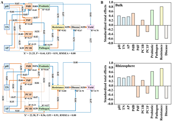 圖3改良劑介導(dǎo)的土壤性質(zhì)和微生物群落特征與抑病能力及大豆產(chǎn)量的互作關(guān)系