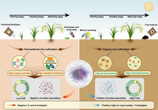 有機(jī)農(nóng)業(yè)作為一種環(huán)境友好型農(nóng)業(yè)管理方式,在提升土壤健康和促進(jìn)可持續(xù)農(nóng)業(yè)發(fā)展方面受到廣泛關(guān)注。然而,有機(jī)種植如何通過調(diào)控土壤微生物群落提升碳利用效率(CUE),進(jìn)而增強(qiáng)土壤碳匯功能,其機(jī)制尚不清晰。近日,中國科學(xué)院東北地理與農(nóng)業(yè)生態(tài)研究所農(nóng)田分子生態(tài)學(xué)科組在東北黑土區(qū)系統(tǒng)比較了長(zhǎng)期有機(jī)與常規(guī)兩種水稻栽培模式下,土壤微生物CUE在水稻生育期內(nèi)的動(dòng)態(tài)變化,并結(jié)合土壤理化性質(zhì)、微生物群落結(jié)構(gòu)、酶活性及生態(tài)化學(xué)計(jì)量學(xué)特征,深入解析了微生物CUE驅(qū)動(dòng)土壤有機(jī)碳動(dòng)態(tài)的特征與機(jī)制。