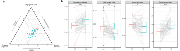 農(nóng)田土壤顯著降低了土壤生物群落在分類組成、功能基因和生態(tài)策略的空間異質(zhì)性。農(nóng)田土壤中細菌、真菌、古菌、微型動物群落(圖1)及功能基因(圖2)在局域和區(qū)域尺度均表現(xiàn)出顯著的均質(zhì)化趨勢,這種均質(zhì)化現(xiàn)象與土壤性質(zhì)的趨同性密切相關(guān)。農(nóng)業(yè)活動改變了細菌群落的生態(tài)策略(“Y-A-S” 理論框架,圖3),其資源獲取(A策略)的功能基因減少,而與生長產(chǎn)量(Y策略)和脅迫耐受(S策略)的基因顯著增加,表明農(nóng)業(yè)系統(tǒng)更傾向于選擇快速生長、抗逆性強的微生物類群。農(nóng)田土壤中細菌的平均基因組大小顯著減小,反映了在農(nóng)業(yè)干擾下微生物通過“基因組精簡”(Black Queen hypothesis)降低了生物的代謝成本、提高了適應性的生態(tài)權(quán)衡。