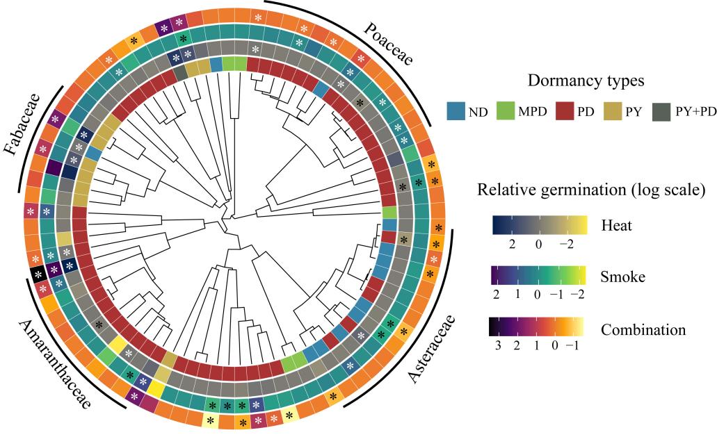 研究發(fā)現(xiàn),供試的80個(gè)物種中,有24個(gè)物種的種子萌發(fā)受到火干擾信號(hào)的顯著促進(jìn),其中11個(gè)物種對(duì)熱激處理表現(xiàn)出顯著響應(yīng),13個(gè)物種對(duì)煙信號(hào)表現(xiàn)出顯著響應(yīng)。然而,這些萌發(fā)響應(yīng)并未表現(xiàn)出顯著的系統(tǒng)發(fā)育信號(hào)。研究進(jìn)一步闡明,種子休眠類(lèi)型與解除休眠所需的特定火干擾信號(hào)密切相關(guān),且一年生與多年生物種在對(duì)火干擾信號(hào)的萌發(fā)響應(yīng)上表現(xiàn)出顯著差異。以上結(jié)果表明,植物是否對(duì)火敏感,并不依賴(lài)于它們的親緣關(guān)系,而更多地取決于繁殖性狀。盡管整體萌發(fā)率的提高幅度有限,但物種及功能群對(duì)火干擾信號(hào)的差異性響應(yīng)揭示了野火在重塑群落結(jié)構(gòu)與組成中的潛在重要性。該研究為深入理解溫帶草原火后植被恢復(fù)機(jī)制提供了新的科學(xué)依據(jù),也為草地生態(tài)系統(tǒng)的管理與恢復(fù)提供了理論支撐。