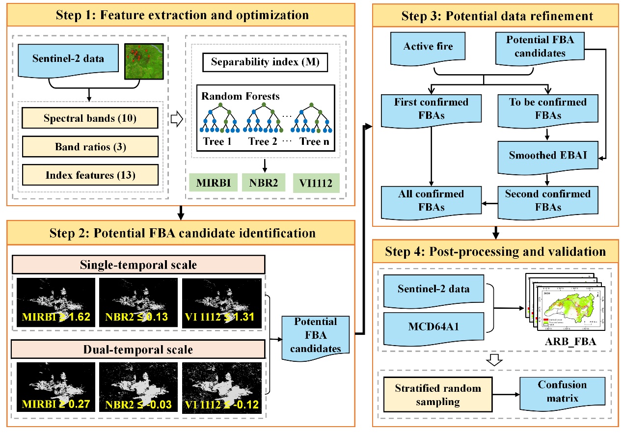 針對(duì)上述問(wèn)題,中國(guó)科學(xué)院東北地理與農(nóng)業(yè)生態(tài)研究所任春穎研究員團(tuán)隊(duì)研發(fā)了一套融合活躍火數(shù)據(jù)與Sentinel-2多時(shí)序影像的森林火燒跡地精準(zhǔn)檢測(cè)方法框架。研究人員通過(guò)引入火燒導(dǎo)致的反射率突變及火后短期光譜異常信息,構(gòu)建了增強(qiáng)型火燒跡地指數(shù)(EBAI),顯著提升了火燒區(qū)與非火燒區(qū)的光譜區(qū)分能力。基于此方法框架,獲得了黑龍江流域2020-2023年空間分辨率10米、逐月森林火燒跡地產(chǎn)品(ARB_FBA),其錯(cuò)分誤差介于7.65%—8.46%之間,漏分誤差為9.43%—13.02%,Dice系數(shù)高達(dá)89.94%—91.21%。分析結(jié)果表明,黑龍江流域春季(3-5月)為森林火災(zāi)高發(fā)期,2023年火燒跡地面積激增,這一現(xiàn)象與當(dāng)年破紀(jì)錄的熱浪及森林管理疏漏密切相關(guān)。