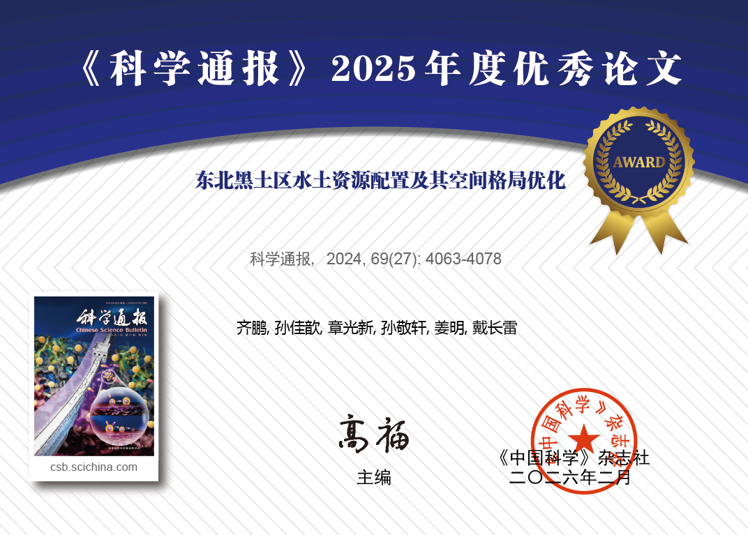 近日,國(guó)內(nèi)權(quán)威學(xué)術(shù)期刊《科學(xué)通報(bào)》公布了2025年度優(yōu)秀論文評(píng)選結(jié)果。由中國(guó)科學(xué)院東北地理與農(nóng)業(yè)生態(tài)研究所齊鵬副研究員(第一作者)、孫佳歆博士、章光新研究員、孫敬軒博士和姜明研究員(通訊作者)聯(lián)合黑龍江大學(xué)戴長(zhǎng)雷教授等學(xué)者共同完成的研究成果——《東北黑土區(qū)水土資源配置及其空間格局優(yōu)化》,憑借論文在保障國(guó)家糧食安全與生態(tài)安全領(lǐng)域的科學(xué)貢獻(xiàn)與應(yīng)用價(jià)值、論文的關(guān)注度及引用率等多項(xiàng)指標(biāo),成功榮獲《科學(xué)通報(bào)》2025年度優(yōu)秀論文獎(jiǎng)(圖1)。