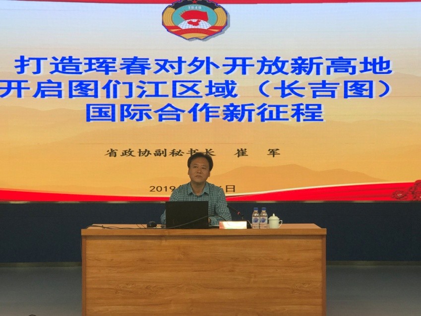 崔軍從新時代、新任務采取新舉措,加快中國圖們江區域(琿春)國際合作示范區建設;順應東北亞地緣形勢新變化,把長吉圖開發開放先導區建設成為東北對外開放示范區;打造琿春對外開放新高地,開啟中國參與圖們江區域國際合作新征程等三個方面;系統闡述了如何打造琿春對外開放新高地開啟圖們江區域(長吉圖)國際合作新征程。崔軍指出,當下我們在多邊框架之內,雙邊關系正處于歷史最好時期,我們要貫徹落實習近平總書記視察吉林和東北座談會的總體要求,加快推進長吉圖先導區建設;我們要積極創造條件,在多邊框架之內實現雙邊突破,以小區域合作帶動大區域合作,切實維護國家邊境安全和長治久安及民生發展。