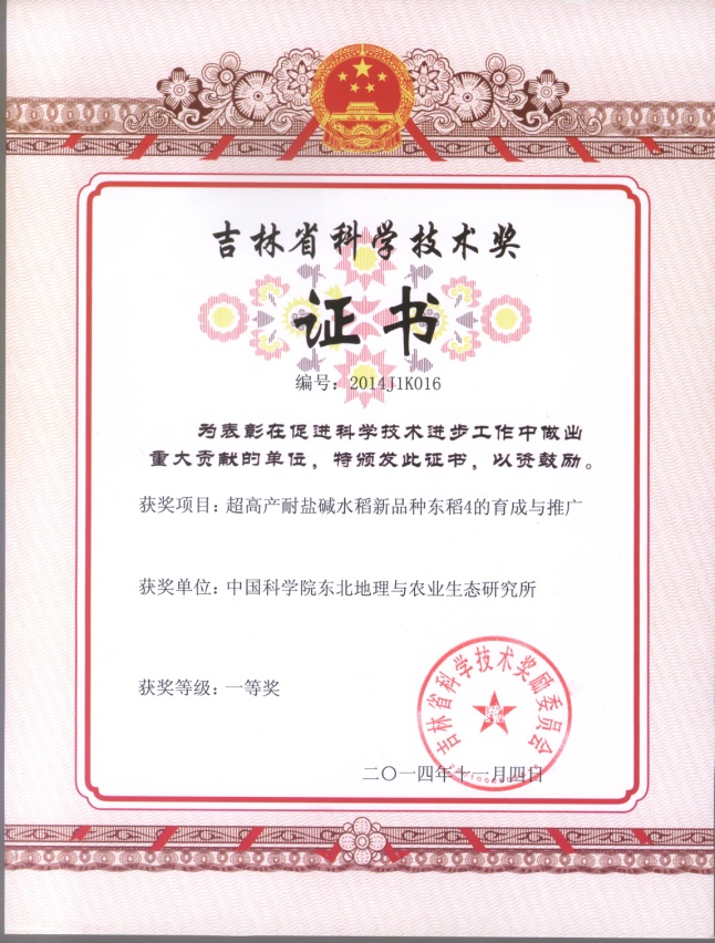 重點(diǎn)培育三“蘇打鹽堿地高效治理關(guān)鍵技術(shù)與示范”的成果采用地理遠(yuǎn)緣雜交、穿梭育種等先進(jìn)育種技術(shù),歷時(shí)16年成功育成東稻4號(hào)水稻新品種。該品種集高產(chǎn)、優(yōu)質(zhì)、多抗、理想株型及廣適性于一體,尤其是耐鹽堿性和抗稻瘟病性,均明顯優(yōu)于吉林省其他主推品種;2010年獲吉林省水稻新品種高產(chǎn)競(jìng)賽一等獎(jiǎng),畝產(chǎn)849.37公斤,創(chuàng)吉林省歷史最高紀(jì)錄;2011年獲全國優(yōu)質(zhì)食味粳稻品評(píng)一等獎(jiǎng)。東稻4已成為吉林省中早至中熟的主推品種,2010-2014年東稻4在吉林省累計(jì)種植面積達(dá)367萬畝,在全國其他適宜地區(qū)推廣170萬畝,社會(huì)經(jīng)濟(jì)效益極其顯著。該成果為水稻育種親本應(yīng)用、育種方法和鑒定技術(shù)的改進(jìn)提高奠定了基礎(chǔ),對(duì)推動(dòng)吉林省水稻生產(chǎn)發(fā)展,保證國家糧食安全具有重要作用。